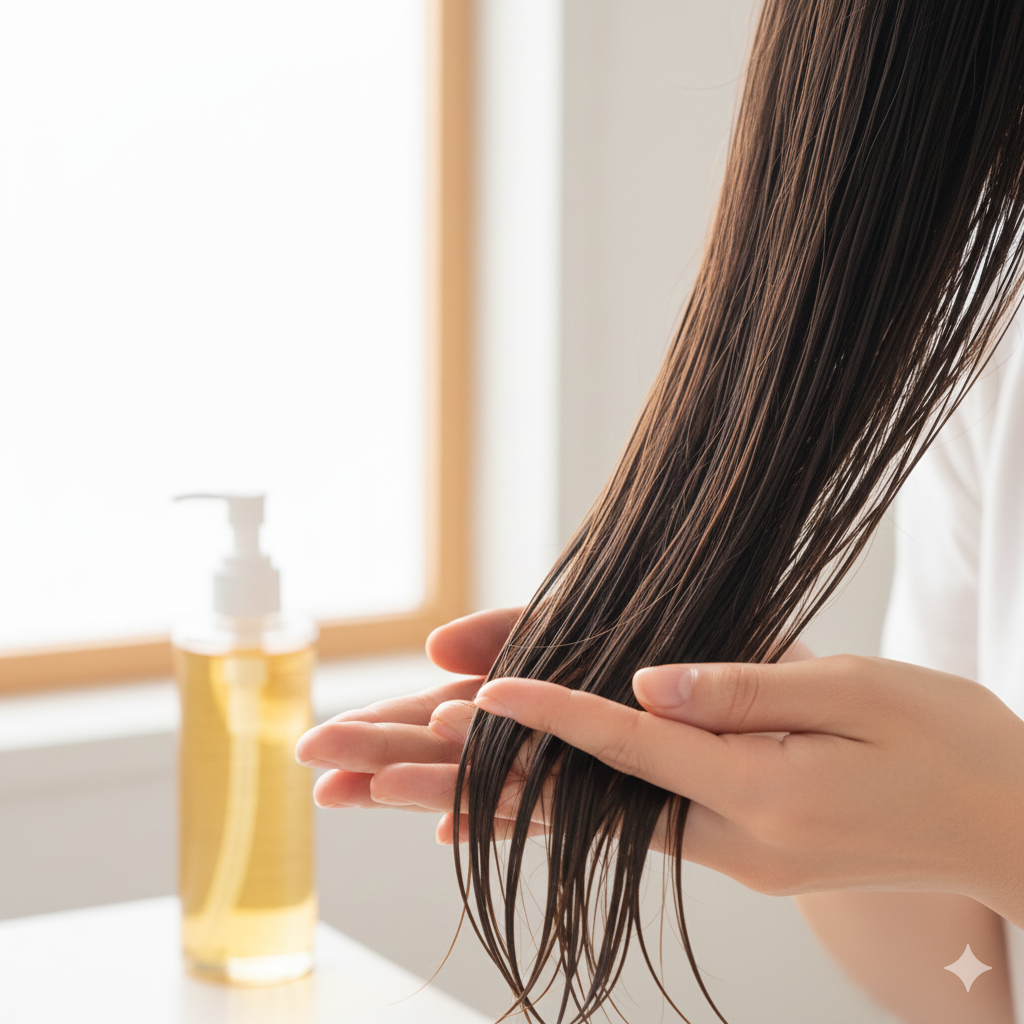 - 根元は「残りカス」でOK:頭皮につくとベタつきや毛穴詰まりの原因になるため、根元付近は手に残った少量を軽くつける程度にします。